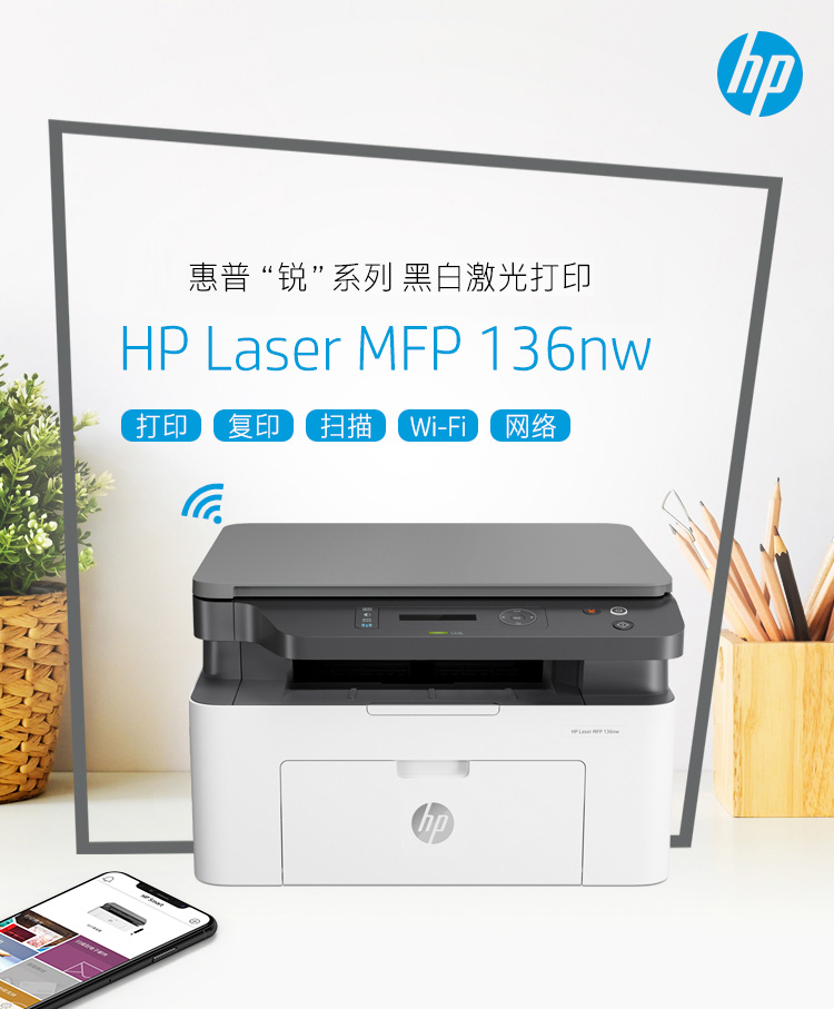 商品名称:惠普(HP)136nw 锐系列激光多功能一体机 三合一 打印复印扫描 132nw升级款
